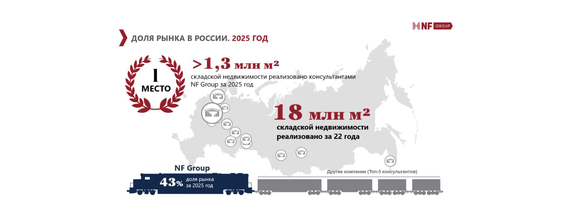 Самая большая команда на рынке — 34 человека 5 лет подряд — консультант года по версии CRE Moscow Awards 43% доли рынка складской недвижимости среди топ-5 крупнейших компаний рынка Экспертиза федерального уровня и глубокое понимание региональной специфики Представляем интересы собственников, арендаторов и инвесторов Обеспечиваем полный цикл консалтинга в сфере складской и индустриальной недвижимости — от аналитики и подбора объекта до сопровождения и закрытия сделки.